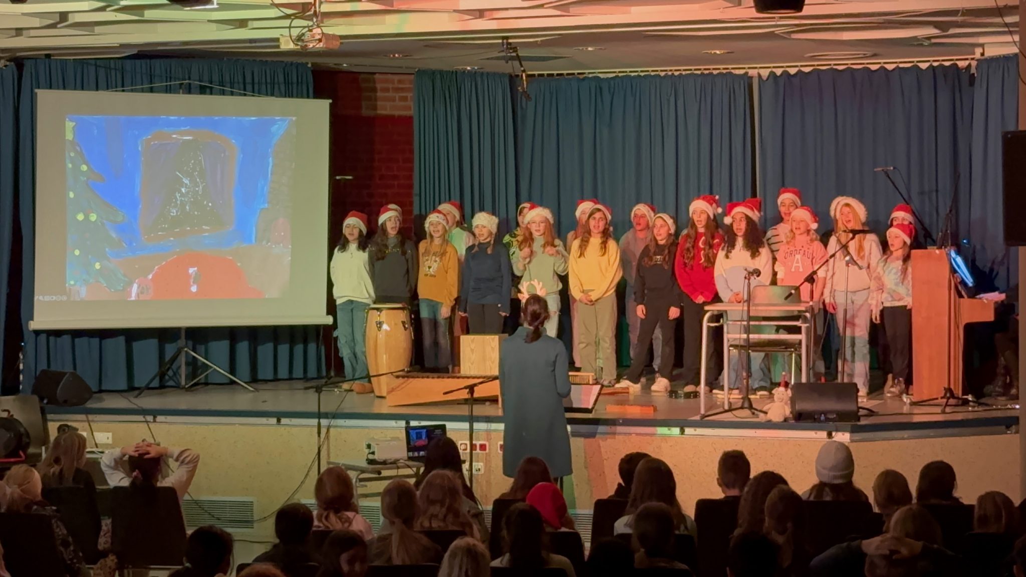 Frau Kuhlmann begleitete die Klasse am Klavier und Frau Maerz-Biehl unterstützte sie beim Singen. Eine Schülerin hat sogar ein Lied mit der Flöte begleitet. Zudem gab es zur Geschichte passende Bilder, die im Kunst Unterricht gezeichnet und gemalt wurden. Während der Aufführung wurden sie auf einer Leinwand gezeigt.