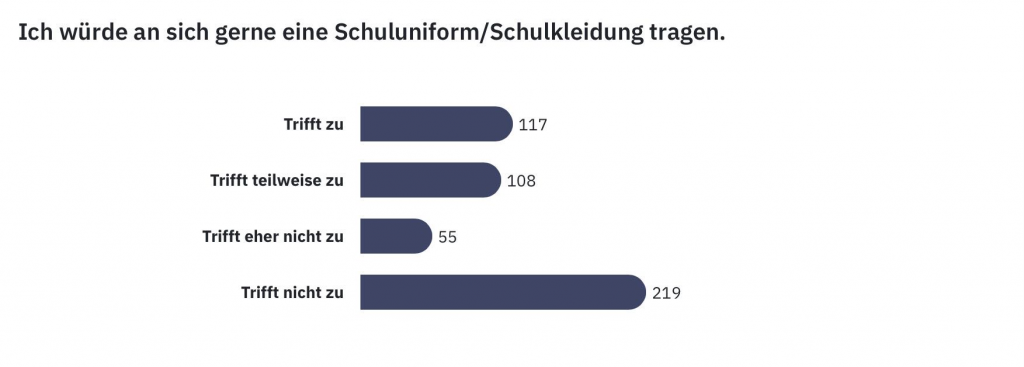 Ein Nachteil der Schuluniform ist, dass viele Schüler*innen sich unwohl fühlen, nicht ihre eigen gewählte Kleidung anziehen zu dürfen. Sie finden, die eigene Kleidung tragen zu können, ist wichtig für die Selbstdarstellung und die Entfaltung der eigenen Persönlichkeit, welche mit einer Schuluniform eingeschränkt werden würde. Viele finden es auch unangenehm, dass alle das gleiche anhaben wie sie und dass sie jeden Tag dasselbe anziehen müssen. Jedoch könnte man auch Schulkleidung einführen. Das heißt die Schüler können sich aus einer Vorgegeben Kollektion ihre Klamotten aussuchen.