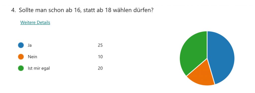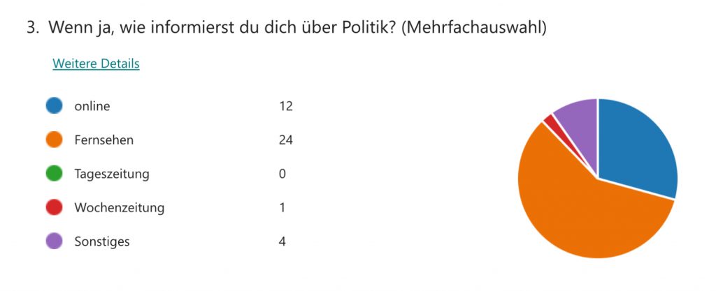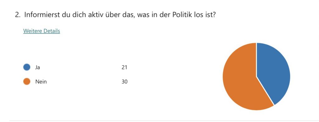 Sind die 7. und die 8. Jahrgangsstufe des Gymnasium Köln-Pesch politisch interessiert? In Anlehnung an die Shell-Jugendstudie haben wir, Martha und Luisa aus der 7d, eine Umfrage zum Thema „Politisches Interesse“ erstellt. Von 227 Schüler:innen der Klassen 7 und 8 haben 53, also ca. 1/4 der Schüler:innen in diesen Jahrgängen, an der Umfrage teilgenommen. Laut der Shell-Jugendstudie lag das Politische Interesse 2019 bei circa 41%. Am GKP waren dies mit 36% knapp weniger, die starkes Interesse oder Interesse an politischen Themen bekundeten. 19% waren hingegen gar nicht interessiert. 58% am GKP informieren sich nicht aktiv darüber, was in der Politik los ist. Die, die sich informieren, tun dies meist über das Fernsehen oder online, im Gegenteil zur Tageszeitung, mit null Prozent der Stimmen. Zusammenfassend lässt sich sagen, dass das politische Interesse der Schüler am GKP sehr gemischt ist. Bereits von einer Politikverdrossenheit zu sprechen, wäre hier wohl etwas unangebracht, denn schließlich waren ja nur ein Fünftel der Befragen gar nicht an Politik interessiert.