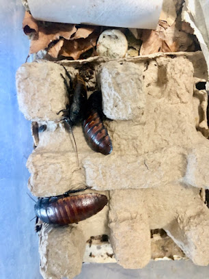 Die Gehege der Tiere stehen in einer Vitrine im Naturwissenschafts-Trakt. Das klingt jetzt erst mal nicht nach viel Platz, aber schon allein die kleinste Schildkröte lebt in zwei großen Aquarien. Die kleinen Fauchschaben oder die wandelnden Blätter, wie die „Schrecken“ genannt werden, geben sich natürlich auch mit weniger Platz zufrieden. Um die Tiere kümmern sich Schüler*innen, das heißt sie füttern sie, machen ihre Gehege sauber und nehmen sie auch mal auf die Hand, zumindest die Schrecken.